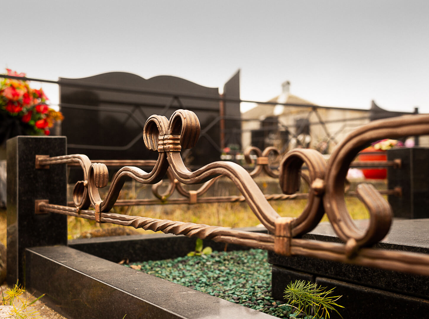 Гранитные памятники благородно смотрятся на участке с захоронением в окружении оградки, частично или полностью изготовленной из аналогичной породы камня, нержавеющей стали, металла или кованых элементов.