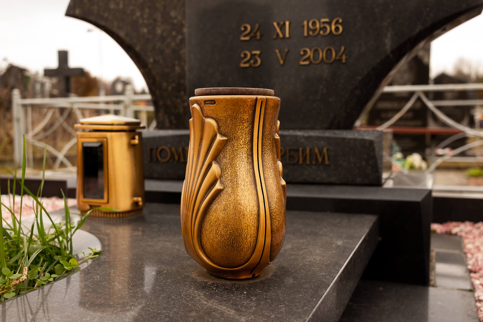 Вазы из бронзы и латуни всегда выставлены в фирменном подсвеченном дисплее, позволяющем представить эти изделия – без преувеличения – в самом выгодном свете. Там же всегда выставлена как минимум одна бронзовая лампада. Это еще один эффектный аксессуар, в который можно установить свечу – например, в преддверии религиозного праздника. Лампада из бронзы доступна в различных размерах и формах. Она монтируется на надгробную плиту или (при наличии) на выступ в стеле или тумбе надгробного комплекса.