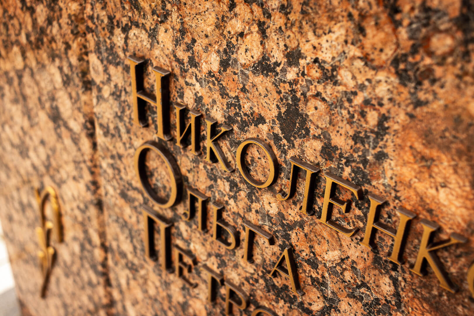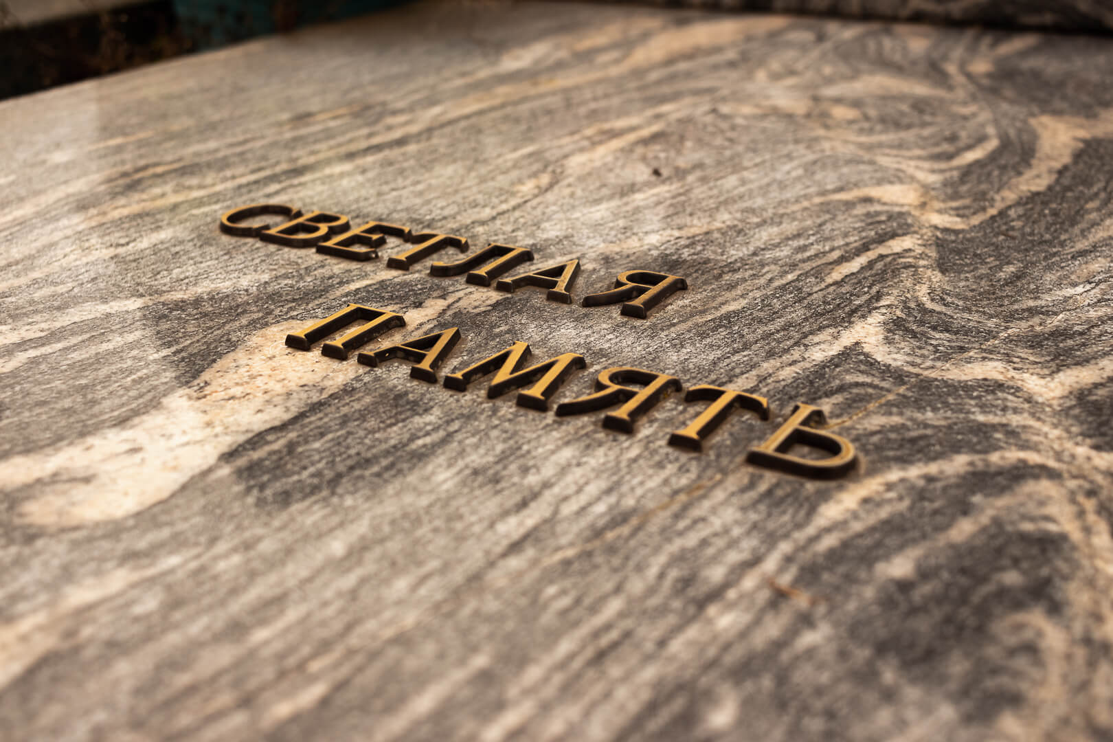 Пожалуй, единственным показателем, по которому бронзе можно предпочесть гравирование надписи, является цена. Но давайте рассмотрим этот момент в комплексе. Прежде всего, буквы из бронзы могут быть установлены на гранитную поверхность любого цвета. Они прекрасно оттенят черный камень и совсем не «потеряются» на сером или цветном граните. Выбитая надпись станет «одной из многих», тогда как бронза выгодно выделит монумент – даже если его форма не отличается оригинальностью. Несложно и добавить надпись из бронзовых букв, например на семейном памятнике, не говоря о ее восстановлении. Уход за бронзовыми буквами необходим, но он не настолько сложен, как, например, забеливание текста.