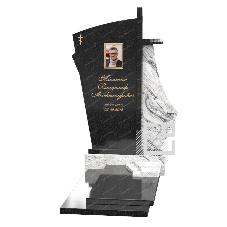 Сложная форма со смещенным центром тяжести - применительно к стеле и к надгробной плите. Эффект дополнительно усиливается благодаря использованию двух видов камня. Преобладание прямых углов и линий относит данный памятник к категории мужских.