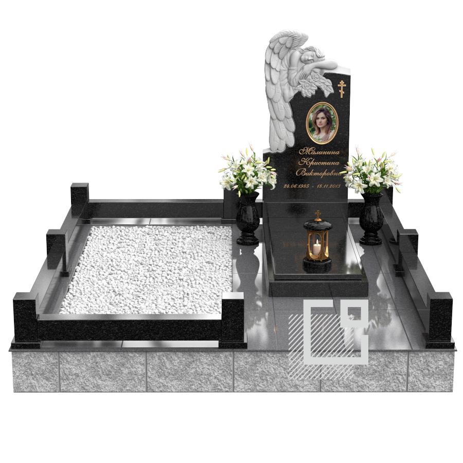 Комплекс включает памятник со скульптурой ангела, закрытый цветник и гранитную ограду на фундаменте из бессерного блока. Памятник дополняет закрытый практичный цветник. Борты ограды приподняты над плиткой для возможности стока воды с участка.