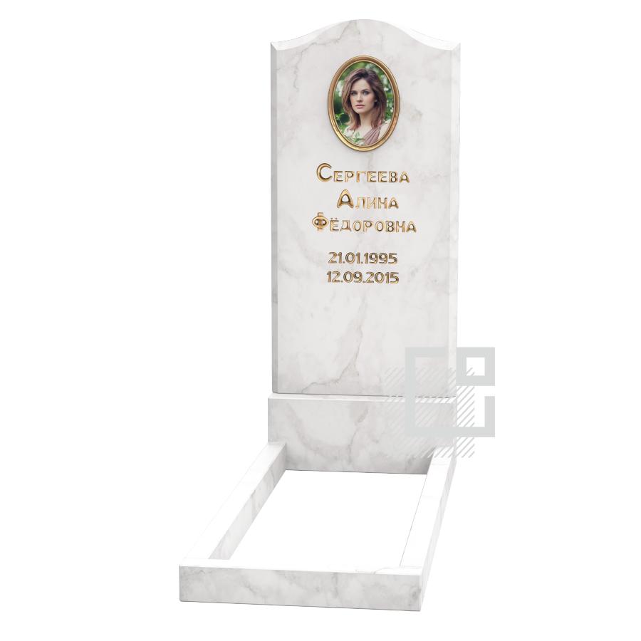 Симметричная форма с прямыми сторонами и волной по верху позволяет свободно разместить нужное количество надписей благодаря отсутствию вееров. Главное украшение мраморного памятника – цвет. Белый камень – символ светлой памяти о близком человеке.