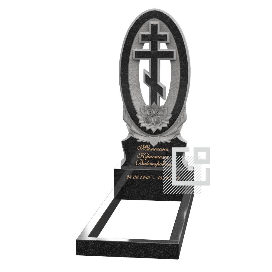 Оригинальный памятник-крест с резными гранитными цветами. Памятник изготовлен из чёрного камня, но благодаря резным элементам комплект светлый, изящный. Овальное обрамление креста символизирует свет и придаёт мягкость гранитной композиции.