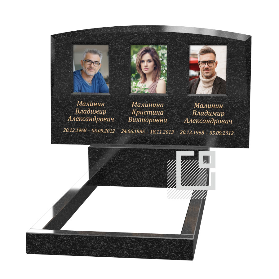 Изделие ТП-02 имеет стандартный размер стелы 100 × 60 × 5 см. Это типовой памятник на троих, который включает в себя комплект из стелы, тумбы и цветника. При необходимости мы можем предложить другие размеры стелы, двойной цветник, а также надгробные плиты размером в ⅓, ⅔ или полноразмерную.